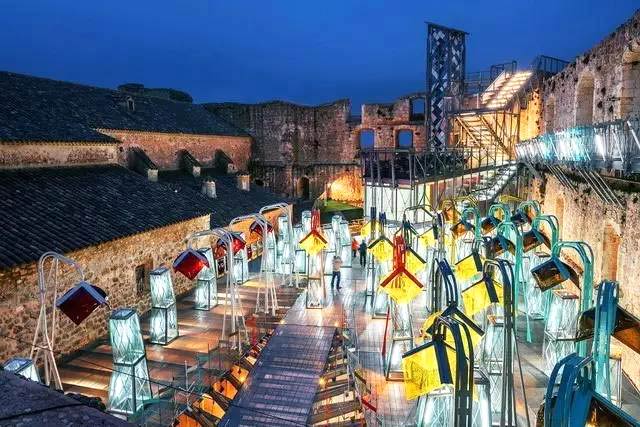 陽(yáng)光穿過(guò)彩色玻璃映照在場(chǎng)地中,而一根根燈柱也散發(fā)著柔和的光,在不驚擾人們欣賞古老建筑和展覽的同時(shí),重塑空間,打造出一系列各不相同,卻相互呼應(yīng)的建筑空間。