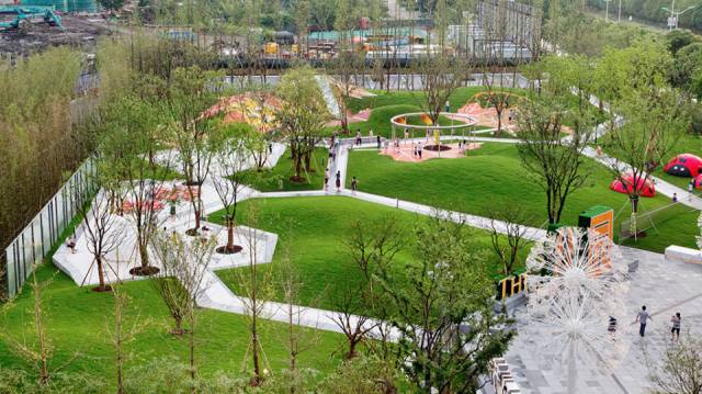 考慮到小公園是一個(gè)臨時(shí)場(chǎng)所,未來(lái)會(huì)被改造成商業(yè)用地,小公園內(nèi)主要由成本可控的波浪草坡和擁有許多可拆卸再利用的活動(dòng)器械的兒童活動(dòng)區(qū)構(gòu)成。白色礫石園路串聯(lián)了整個(gè)公園,與綠色的草坡相映成趣。