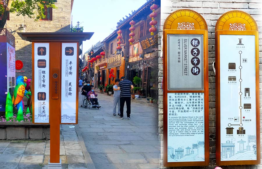 笨鳥文旅集團接手周村古商城規(guī)劃、設(shè)計之后,巧妙的利用周村歷史文化、地域文化、自然空間等特色來打造,結(jié)合周村古商城建筑環(huán)境的一些特質(zhì)選取材質(zhì),使導(dǎo)視系統(tǒng)更好地融入環(huán)境,傳遞文化信息,融入周村文化元素也有助于促進景區(qū)文化特色提升,增加對游客的吸引度。