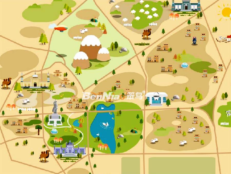 在景區(qū)全景圖設(shè)計(jì)上,選擇手繪地圖繪制風(fēng)格,簡潔、形象且?guī)в幸欢ㄈの缎缘陌研畔⒄宫F(xiàn)給游客。