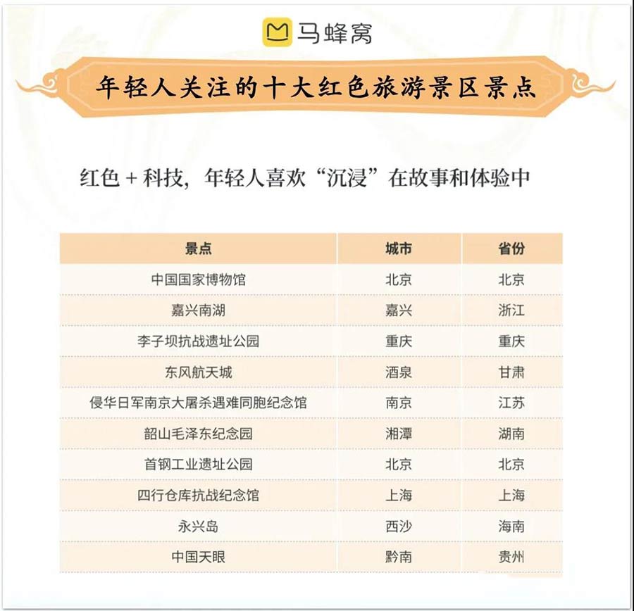 馬蜂窩旅游研究院負(fù)責(zé)人馮饒表示:“年輕游客對(duì)紅色旅游的熱情逐年高漲,這是我們文化自信的一部分。不僅僅是紅色旅游,很多愛(ài)國(guó)主義景區(qū)景點(diǎn)也非常受歡迎?!瘪R蜂窩《旅游新國(guó)潮》報(bào)告顯示,十大最受年輕人喜愛(ài)的愛(ài)國(guó)主義景區(qū)包含中國(guó)國(guó)家博物館、嘉興南湖旅游區(qū)、李子壩抗戰(zhàn)遺址公園、東風(fēng)航天城等。由此可見(jiàn),除紅色旅游外,領(lǐng)會(huì)國(guó)家崛起歷史、走訪航空航天基地、體驗(yàn)大國(guó)重器實(shí)景等,也是年輕旅行者真實(shí)的愛(ài)國(guó)寫(xiě)照。