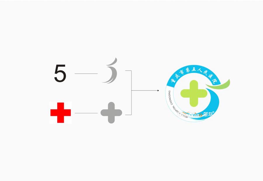 標(biāo)志以五院的“5”與“紅十字”為主要設(shè)計(jì)元素,將文字圖形化,抽象化,進(jìn)行重新的組合排列。在色彩的運(yùn)用上,以藍(lán)色為主要基調(diào),淺綠色進(jìn)行搭配,整體色彩清新、自然、健康。