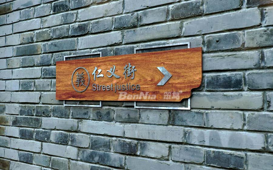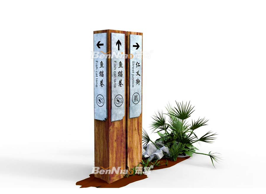 由于用到老木料材質(zhì)的關系,標識標牌的造型表現(xiàn)多在銹蝕鋁板上進行,以免由于材質(zhì)的特殊性造成加工困難。