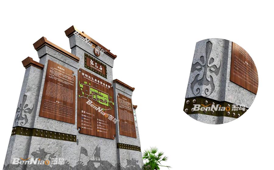 結(jié)合張飛廟文化特點(diǎn),本次云陽張飛廟標(biāo)識(shí)導(dǎo)視系統(tǒng)概念方案充分結(jié)合該廟歷史文化,融入整個(gè)廟宇的建筑風(fēng)格。體現(xiàn)其古老、厚重的歷史韻味,使其標(biāo)識(shí)與景區(qū)環(huán)境融為一體讓標(biāo)識(shí)真正做到融入環(huán)境、營造和諧。