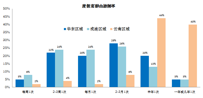 受交通條件及經(jīng)濟水平等因素影響,華東地區(qū)和成渝地區(qū)客群出游頻率較高,超9成客群每半年都有一次或多次出游經(jīng)歷。而云南客群出游頻率很低,集中在1年出游1-2次。