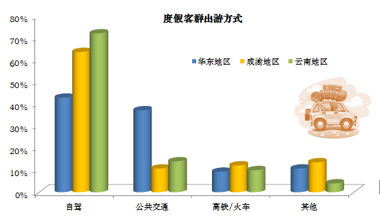 隨著中短途旅游持續(xù)火爆,方便、快捷的自駕車是目前出游主要方式,其不但可以將親近的人維系在一個空間里無所顧忌,并且可以隨時欣賞沿途風(fēng)景,受到越來越多客群青睞,相比西南地區(qū),華東客群由于城市交通擁堵等因素,對公共交通具有一定偏好。