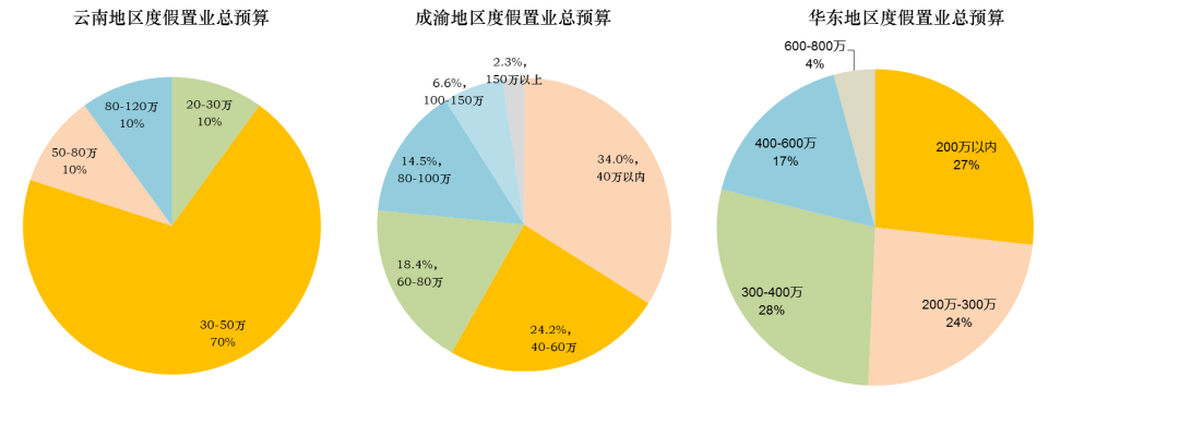 華東客群對度假物業(yè)總預(yù)算分層較明顯,需求較為多元化,總預(yù)算200萬以上占比超7成;云南地區(qū)度假置業(yè)總預(yù)算集中50萬元以下,占比約8成;成渝地區(qū)度假置業(yè)總預(yù)算接受范圍集中80萬以下,占比約8成。