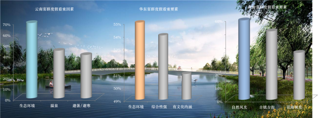 優(yōu)美自然環(huán)境是首選,人們在面對當下無處不在壓力的時候,越來越渴望親近大自然,希望在一個綠色、生態(tài)自然的環(huán)境中體驗度假生活。區(qū)域生態(tài)環(huán)境為度假客群首要看重因素和關(guān)注的要點,是客戶發(fā)生度假行為主導(dǎo)因素。