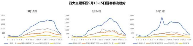而日均客流是衡量主題公園是否受歡迎的重要因素之一,因此報(bào)告選取了2019年中秋節(jié)期間(9.13-9.15)四大主題公園的日均客流趨勢(shì),進(jìn)行對(duì)比分析。