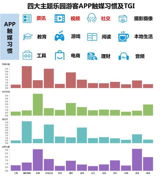 四大游樂園游客人群表現(xiàn)出一些普遍的APP觸媒偏好,包括資訊類、視頻類、社交類、攝影攝像類,也包括教育類、理財(cái)類等APP,說明四大主題公園的游客大多關(guān)注資訊,有一定的生活品質(zhì),也具有一定的投資意識(shí)和投資能力,同時(shí)具有較強(qiáng)的線上消費(fèi)能力。