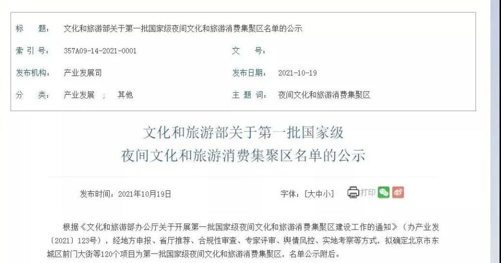 2021年7月5日,《文化和旅游部辦公廳關(guān)于開(kāi)展第一批國(guó)家級(jí)夜間文化和旅游消費(fèi)集聚區(qū)建設(shè)工作的通知》(辦產(chǎn)業(yè)發(fā)〔2021〕123號(hào))發(fā)布。貫徹落實(shí)《國(guó)務(wù)院辦公廳關(guān)于進(jìn)一步激發(fā)文化和旅游消費(fèi)潛力的意見(jiàn)》(國(guó)辦發(fā)〔2019〕41號(hào)),大力發(fā)展夜間文化和旅游經(jīng)濟(jì),更好滿(mǎn)足人民日益增長(zhǎng)的美好生活需要,文化和旅游部決定開(kāi)展第一批國(guó)家級(jí)夜間文化和旅游消費(fèi)集聚區(qū)建設(shè)工作,提出具體要求。 2021年10月19日,根據(jù)《文化和旅游部辦公廳關(guān)于開(kāi)展第一批國(guó)家級(jí)夜間文化和旅游消費(fèi)集聚區(qū)建設(shè)工作的通知》(辦產(chǎn)業(yè)發(fā)〔2021〕123號(hào)),擬確定北京市東城區(qū)前門(mén)大街等120個(gè)項(xiàng)目為第一批國(guó)家級(jí)夜間文化和旅游消費(fèi)集聚區(qū),名單公示附后。