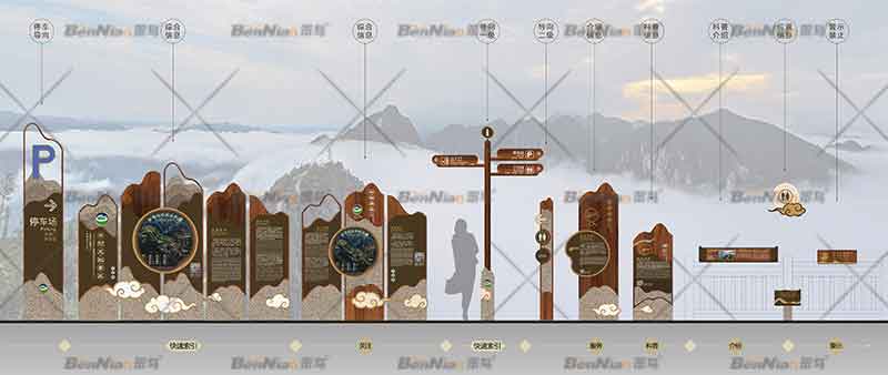 根據(jù)國家出臺(tái)的《旅游景區(qū)公告信息導(dǎo)向系統(tǒng)設(shè)置規(guī)范》,我們將導(dǎo)向系統(tǒng)分為:位置標(biāo)志、導(dǎo)向標(biāo)志、平面示意圖、安全標(biāo)志等。在實(shí)際使用中,大部門包含圖文信息的牌子,其目的主要是向游客傳遞景區(qū)相關(guān)信息資訊,包括導(dǎo)游圖類、導(dǎo)向?qū)б?、名稱導(dǎo)視、游客須知、解說牌示、警示導(dǎo)視、溫馨提示等等。