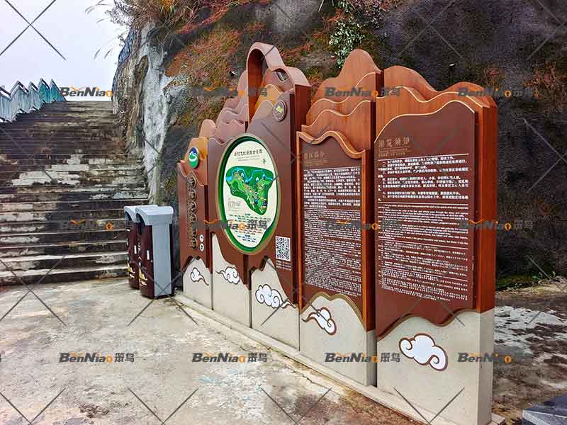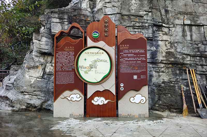 景區(qū)導(dǎo)視牌的材料也是非常講究,既要求牢固性又要體現(xiàn)環(huán)保性,還要考慮安全、耐久在創(chuàng)評(píng)分標(biāo)準(zhǔn)里有明確要求。在制作工藝上應(yīng)力求品質(zhì)精準(zhǔn)規(guī)范、堅(jiān)固耐用,文字、圖示不易腐蝕,不易褪色,且便于清洗;避免出現(xiàn)尖角、突出物等易導(dǎo)致游客發(fā)生碰撞的危險(xiǎn)因素。在安裝過程中應(yīng)與空間環(huán)境相協(xié)調(diào),營(yíng)造一種和諧的氛圍,使之相互襯托,從而達(dá)到既能有利于生態(tài)保護(hù),又能很好地體現(xiàn)景區(qū)標(biāo)識(shí)設(shè)計(jì)、制作的特色目的。