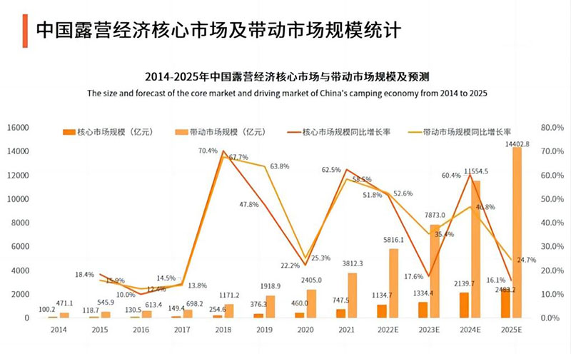 傳統(tǒng)的旅游形式已不在滿足人們的消費(fèi)需求、情感需求,露營(yíng)旅游的自由性、隨意性、休閑性、特色性正在被旅游者們發(fā)現(xiàn)并逐漸重視。據(jù)數(shù)據(jù)統(tǒng)計(jì)研究,在近十年期間,露營(yíng)企業(yè)持續(xù)增加,市場(chǎng)規(guī)模也持續(xù)擴(kuò)大,2020年企業(yè)數(shù)量漲幅接近200%,2021年企業(yè)數(shù)量漲幅超過78%,露營(yíng)經(jīng)濟(jì)核心市場(chǎng)規(guī)模同比增長(zhǎng)62.5%。