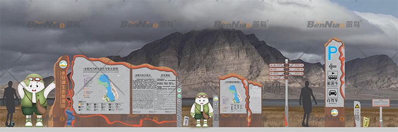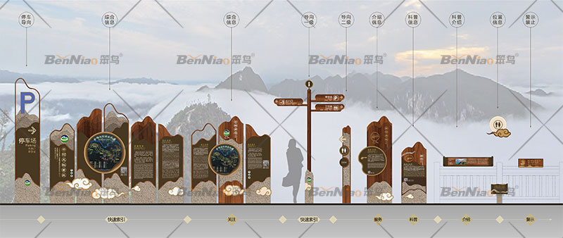 標識系統(tǒng)是結合環(huán)境與人之間的信息界面系統(tǒng),導視具有標志、信號、說明、指示等含義。旅游景區(qū)標識系統(tǒng)不僅起到景區(qū)景點的指引、介紹等作用,也是旅游景區(qū)形象名片和文化展示窗口,游客的每一次駐足,無形中都是對景區(qū)文化的一次識讀、記憶和審美感受。因此在旅游景區(qū)標識系統(tǒng)設計中要充分考慮文化元素的有機融入。