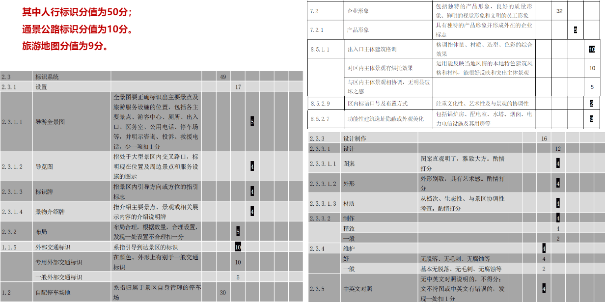 達(dá)到850分。其中人行標(biāo)識分值為50分;通景公路標(biāo)識分值為10分。旅游地圖分值為9分。