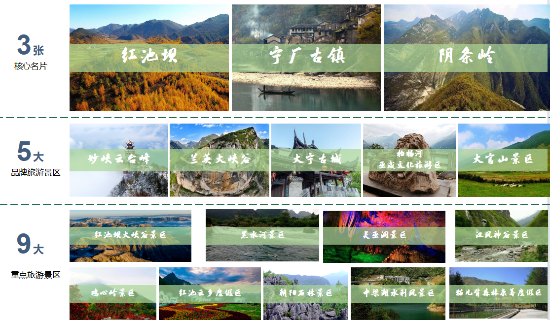 9大重點旅游景區(qū):紅池壩大峽谷景區(qū)、黑水河景區(qū)、靈巫洞景區(qū)、漢風神谷景區(qū)、雞心嶺景區(qū)、紅池云鄉(xiāng)度假區(qū)、朝陽石林景區(qū)、中梁湖水利風景區(qū)、貓兒背森林康養(yǎng)度假區(qū)