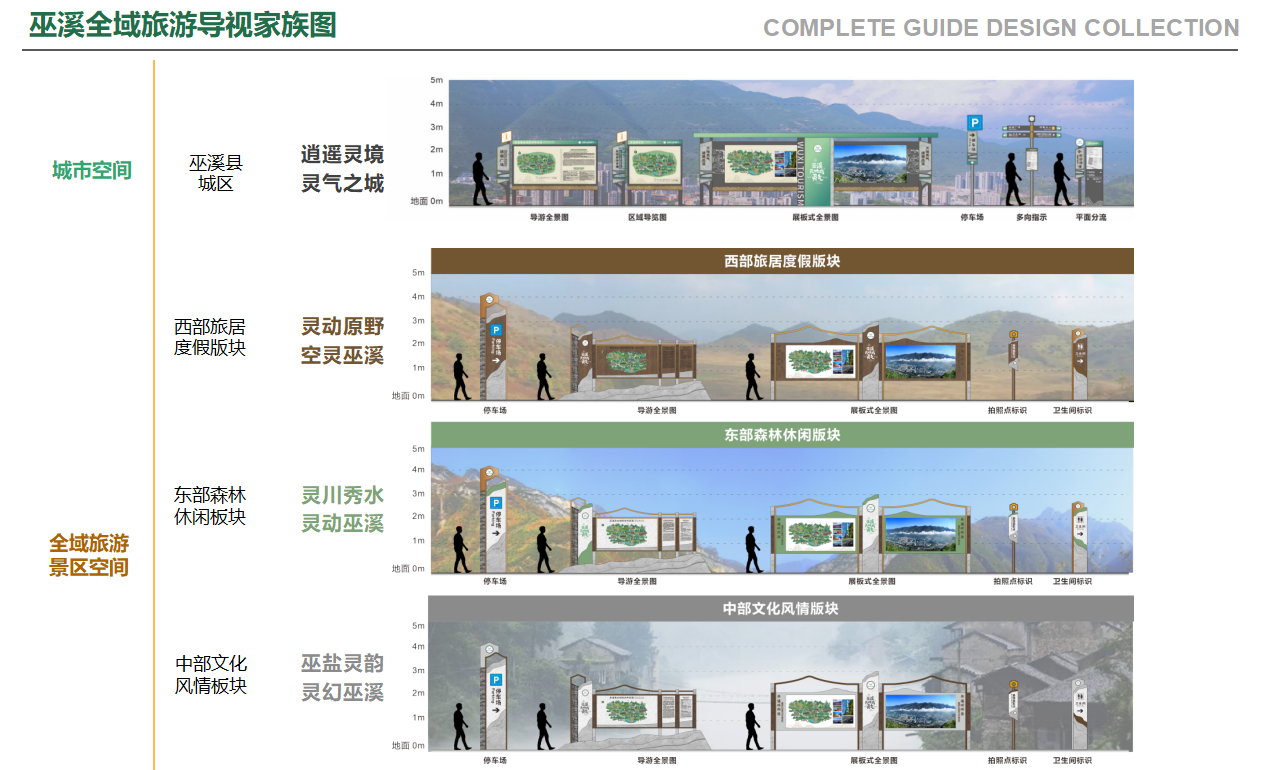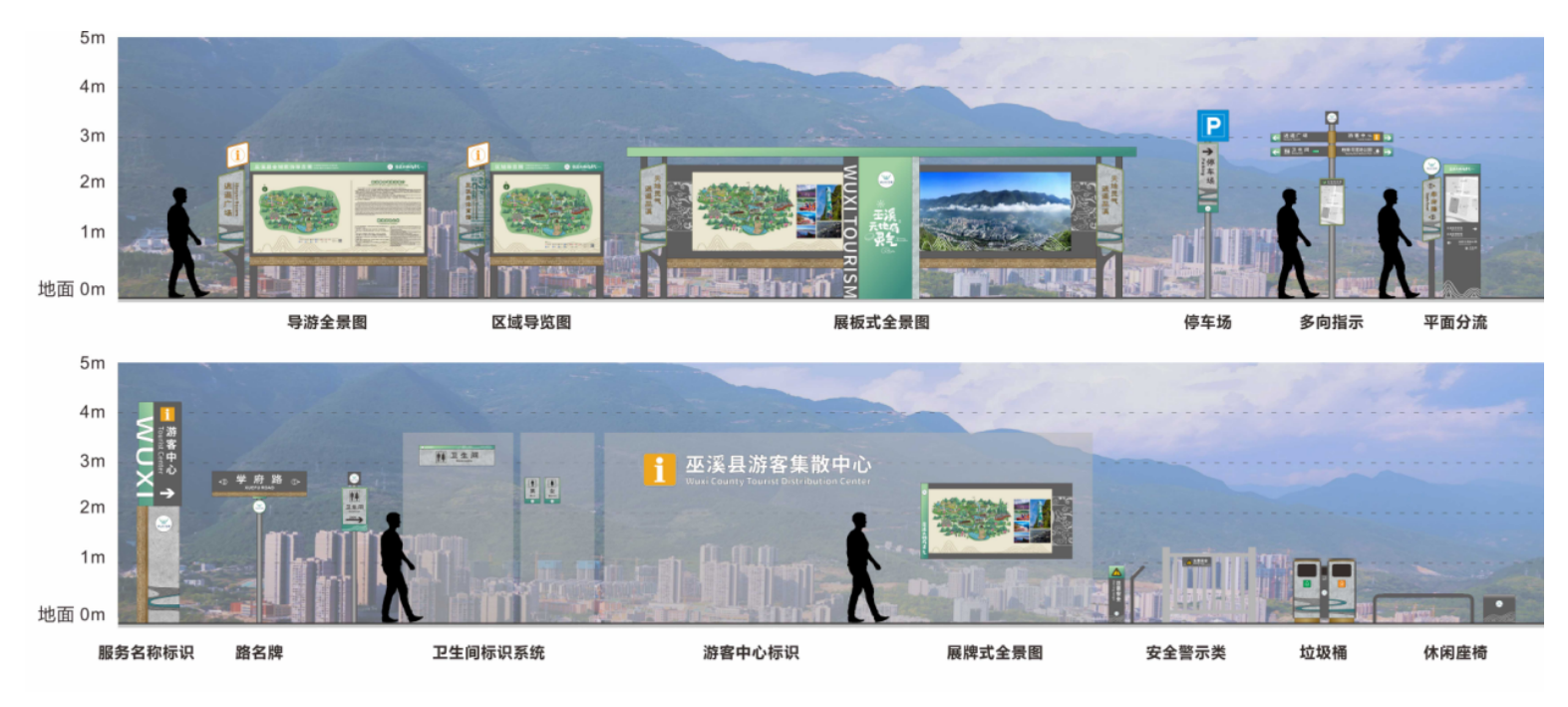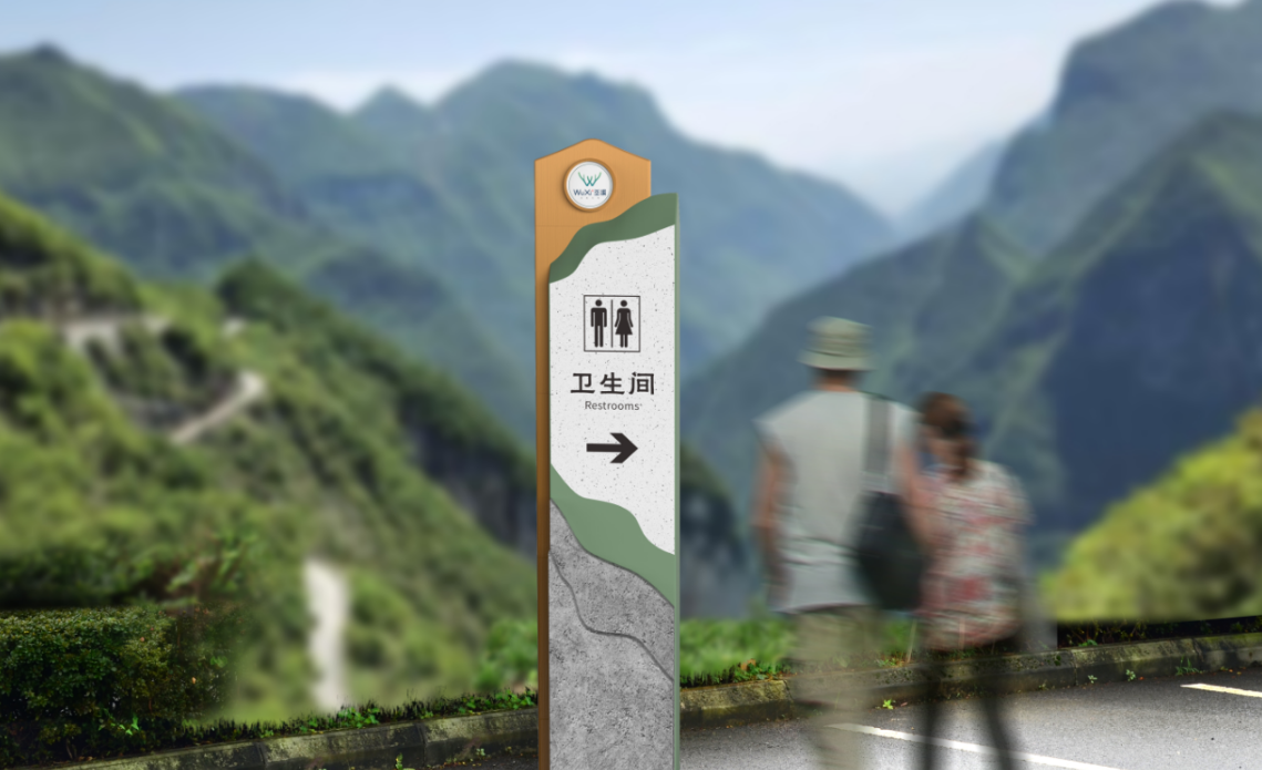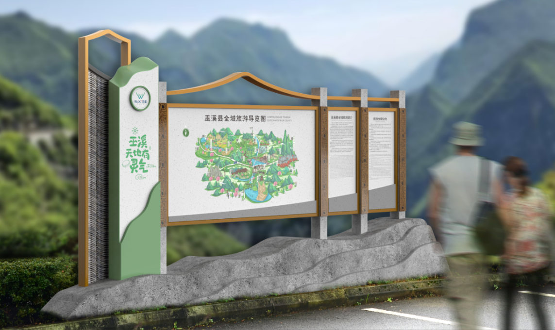 設計分析:自然風貌、巫溪民居特點、石材基底,風格寫意;缺點:各個節(jié)點標識現(xiàn)狀風格各異,需統(tǒng)一風格滿足全域旅游規(guī)范