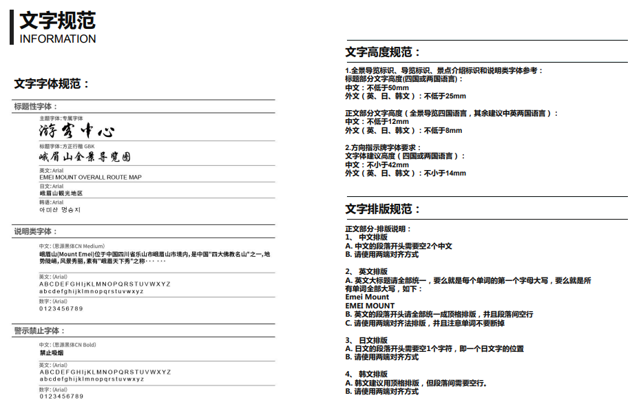 四川峨眉山作為國家5A級景區(qū),導視系統(tǒng)從文字字體的規(guī)范、文字高度規(guī)范、文字排版規(guī)范、圖形規(guī)范、信息登載規(guī)范、信息高度規(guī)范、景點標識設置等都嚴格按照相關規(guī)范進行排版設計。