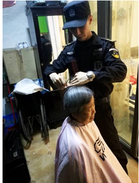 庹軍到金輝物業(yè)公司上班以前就從事了多年的理發(fā)工作,當(dāng)他得知兩位老人的情況后,便提前準(zhǔn)備好了自己久違的理發(fā)工具,待下班后,就來到兩位老人的家中,細(xì)心地為他們理起發(fā)來。這個小伙子的理發(fā)技藝確實了得,沒過多久,就將兩位老人凌亂的頭發(fā)“收拾”得整整齊齊、大大方方的了。雖說庹軍現(xiàn)在從事的是秩序維護(hù)員的工作,但是他的理發(fā)技藝還沒有落下,現(xiàn)在他重新拿起理發(fā)工具,利用下班時間為兩位老人免費理發(fā)的行為,讓兩位老人十分感動,覺得無比的幸福。