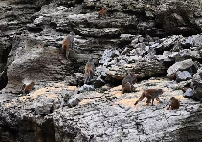 5月26日,野生獼猴在小三峽的猴糧投放點(diǎn)進(jìn)食