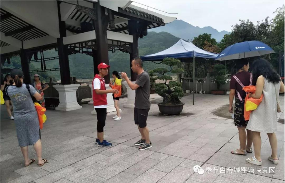 為助力全國(guó)縣級(jí)文明城市和全國(guó)5A級(jí)旅游景區(qū)創(chuàng)建。進(jìn)一步傳承“奉獻(xiàn)、友愛、互助、進(jìn)步”的志愿者精神,傳播文明旅游理念,倡導(dǎo)文明旅游行為,2018年7月13日,奉節(jié)白帝城·瞿塘峽景區(qū)開展以“文明旅游,從我做起”為主題的文明旅游活動(dòng)。來自不同崗位的15名景區(qū)志愿者冒著酷暑,穿梭于景區(qū)的每個(gè)角落,緊緊圍繞服務(wù)咨詢、綠色環(huán)保、救助幫扶、文明交通、安全引導(dǎo)等內(nèi)容,開展集中志愿者服務(wù)活動(dòng),第一時(shí)間為游客提供咨詢幫助,及時(shí)勸導(dǎo)景區(qū)吸煙、亂扔垃圾等不文明行為,以實(shí)際行動(dòng)傳播景區(qū)文明。