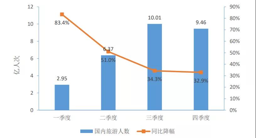 2020年文化和旅游部通過積極爭取紓困政策、指導地方用足用好政策、抓好項目建設、推動產(chǎn)業(yè)創(chuàng)新發(fā)展、加大金融支持產(chǎn)業(yè)高質量發(fā)展等措施,推動旅游業(yè)復蘇取得顯著成效,國內(nèi)旅游呈現(xiàn)分季度降幅收窄趨勢。