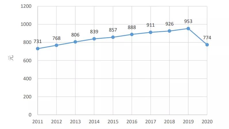 2020年國內(nèi)旅游人均花費774.14元,比2019年同比下降18.8%。其中,城鎮(zhèn)居民人均花費870.25元,下降18.1%。農(nóng)村居民人均花費530.47元,下降16.4%。