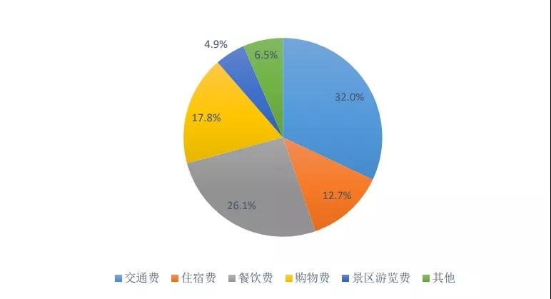 2019年城鎮(zhèn)散客旅游者的出游花費中,交通費所占比重最高,達到了34.3%;其次是餐飲費,占到了23.6%;再次是住宿費,占到了16.7%。