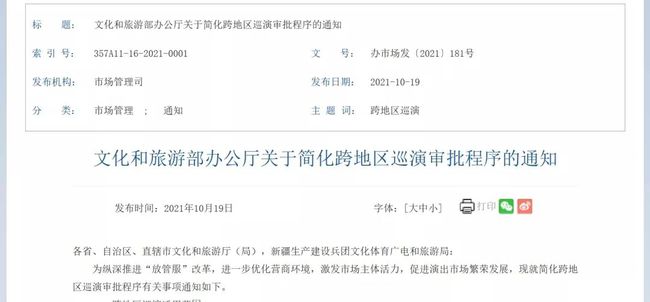 2021年4月,國務(wù)院辦公廳印發(fā)《關(guān)于服務(wù)“六穩(wěn)”“六?!边M(jìn)一步做好“放管服”改革有關(guān)工作的意見》(國辦發(fā)〔2021〕10號(hào)),明確制定跨地區(qū)巡回演出審批程序指南,優(yōu)化審批流程,為演出經(jīng)營(yíng)單位跨地區(qū)開展業(yè)務(wù)提供便利。