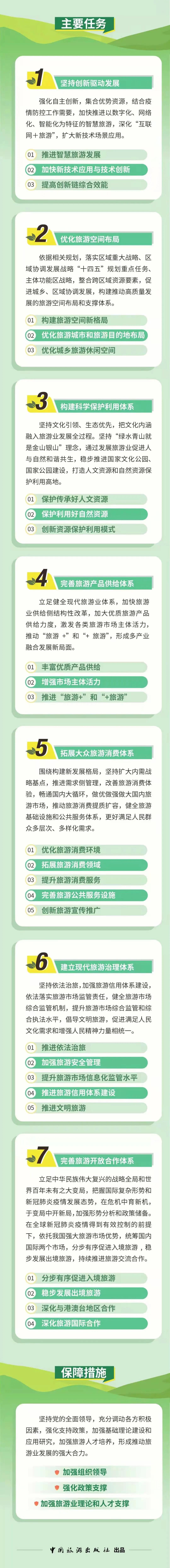 《規(guī)劃》提出七項重點任務。一是堅持創(chuàng)新驅(qū)動發(fā)展,深化“互聯(lián)網(wǎng)+旅游”,推進智慧旅游發(fā)展;二是優(yōu)化旅游空間布局,促進城鄉(xiāng)、區(qū)域協(xié)調(diào)發(fā)展,建設一批旅游城市和特色旅游目的地;三是構(gòu)建科學保護利用體系,保護傳承好人文資源,保護利用好自然資源;四是完善旅游產(chǎn)品供給體系,激發(fā)旅游市場主體活力,推動“旅游+”和“+旅游”,形成多產(chǎn)業(yè)融合發(fā)展新局面;五是拓展大眾旅游消費體系,提升旅游消費服務,更好滿足人民群眾多層次、多樣化需求;六是建立現(xiàn)代旅游治理體系,加強旅游信用體系建設,推進文明旅游;七是完善旅游開放合作體系,加強政策儲備,持續(xù)推進旅游交流合作。