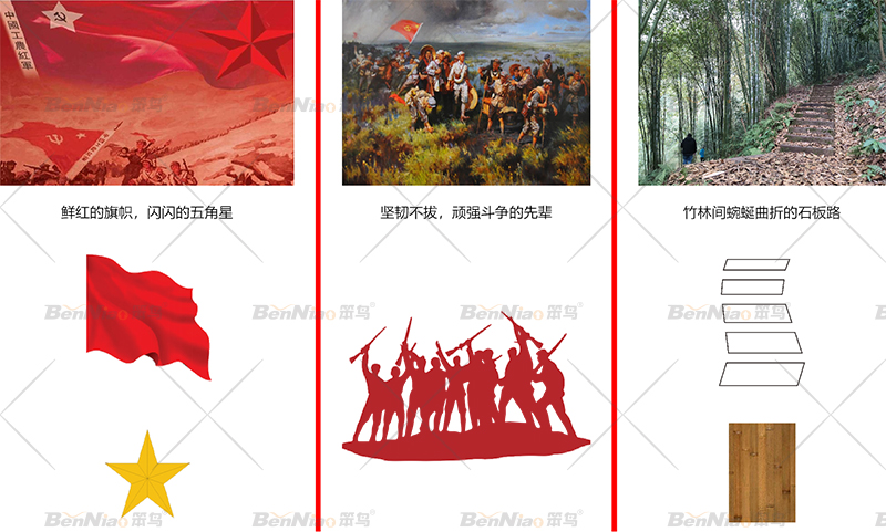 其主要顏色選用的紅、白、城墻灰,長征精神在導(dǎo)視系統(tǒng)中以紅旗、五角星作為主題呈現(xiàn),造型結(jié)構(gòu)上結(jié)合石板路的特征。長征勝利的人物形象,以圖案元素附于主體之上,竹紋元素組件作為點綴。