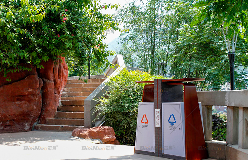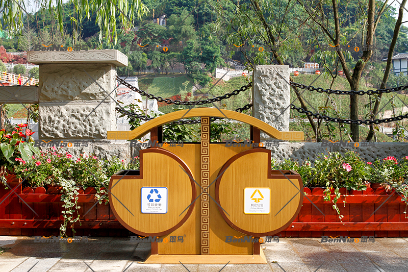 2、景區(qū)垃圾桶,垃圾桶是旅游景區(qū)不可缺少的公共設(shè)施,旅游景區(qū)垃圾桶的設(shè)計(jì)既要考慮科學(xué)性、實(shí)用性也要考慮審美性。科學(xué)與實(shí)用性體現(xiàn)在既方便游客丟垃圾,又方便清潔工人清理垃圾。垃圾桶的外觀可以根據(jù)景區(qū)的地理位置、環(huán)境特點(diǎn)來(lái)設(shè)計(jì)。