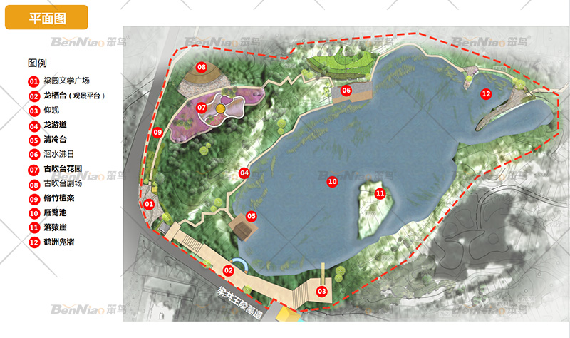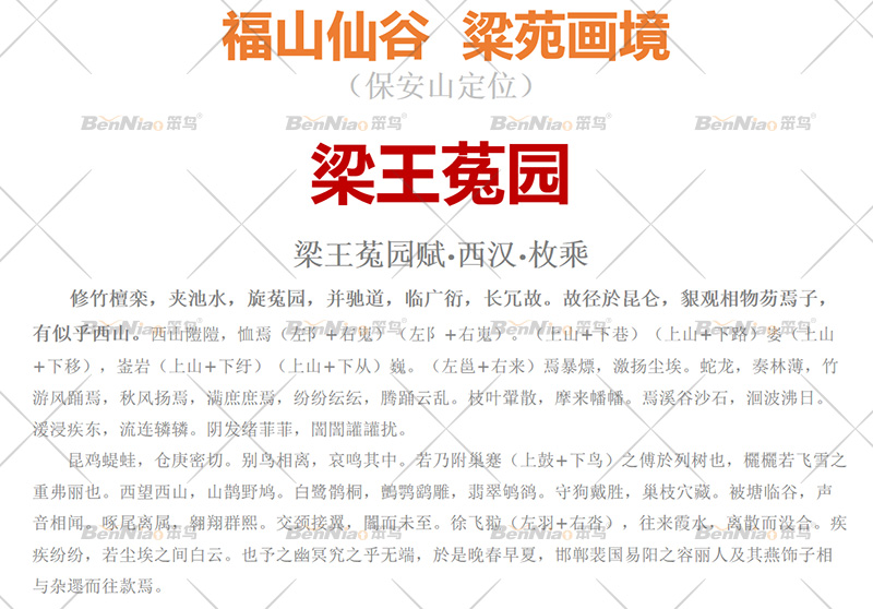 深度挖掘項(xiàng)目人文歷史文化內(nèi)涵,項(xiàng)目以保安山“福山仙谷 粱苑畫境”為主題定位,整體以“梁王菟園”為主題形象進(jìn)行設(shè)計(jì),通過對《梁王菟園賦》中所描繪的歷史自然人文畫卷的解讀與再造提升景區(qū)人文氛圍,增強(qiáng)景區(qū)吸引力。