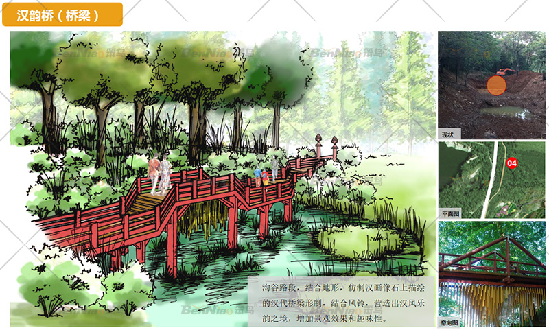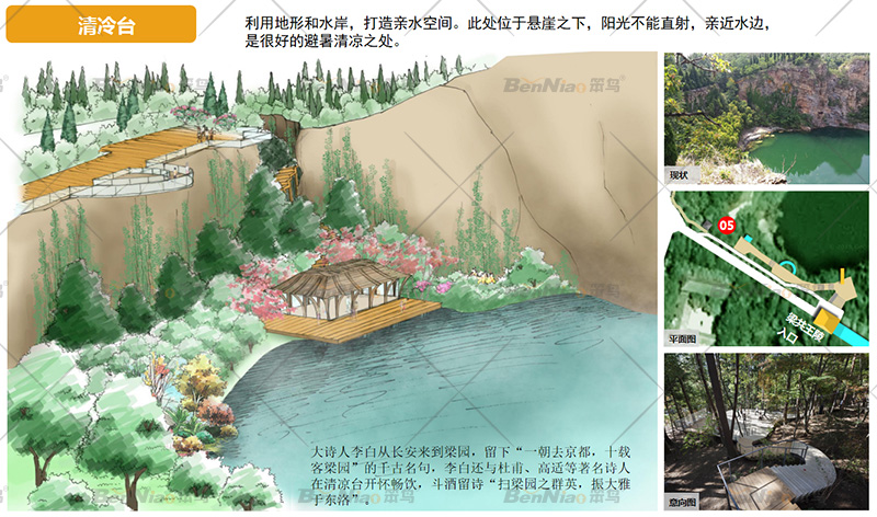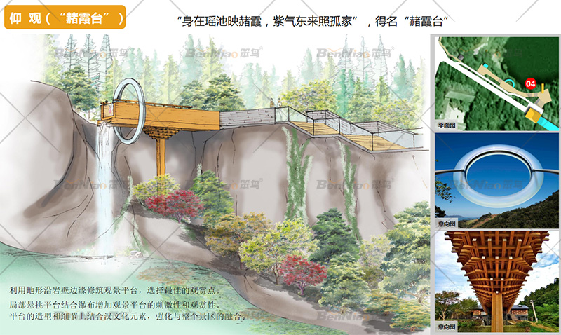 “身在瑤池映赭霞,紫氣東來照孤家”,得名“赭霞臺”利用地形沿巖壁邊緣修筑觀景平臺,選擇最佳的觀賞點(diǎn)。局部懸挑平臺結(jié)合瀑布增加觀景平臺的刺激性和觀賞性,平臺的造型和細(xì)節(jié)上結(jié)合漢文化元素,強(qiáng)化與整個景區(qū)的融合。利用當(dāng)?shù)爻鐾恋奈奈镉耔?,結(jié)合現(xiàn)代的材料,打造網(wǎng)紅節(jié)點(diǎn)。