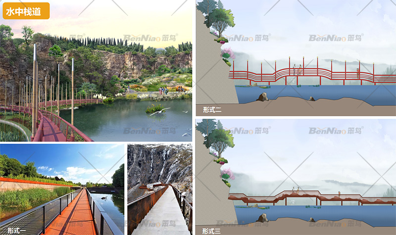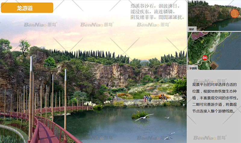 利用采石形成的磯洲,最大程度保留其生態(tài)的風(fēng)貌,增加科普和休息設(shè)施。
