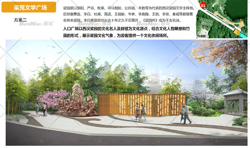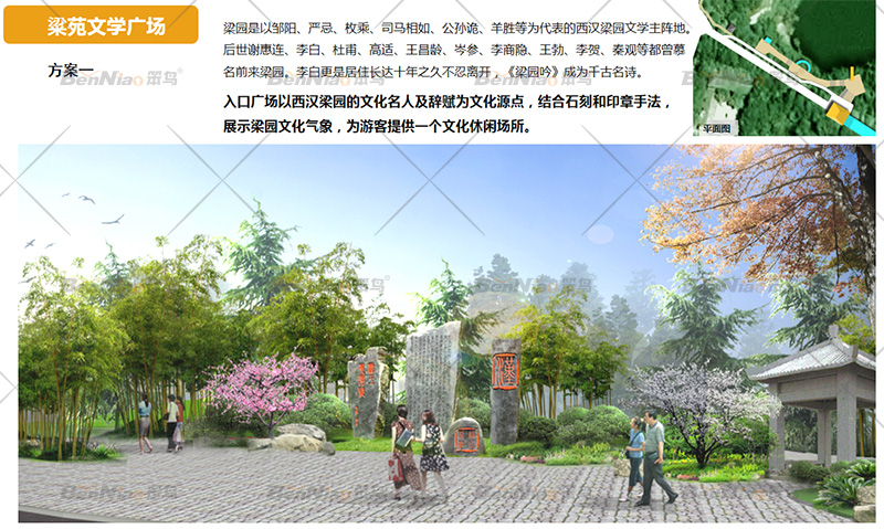 入口廣場以西漢梁園的文化名人及辭賦為文化源點(diǎn),結(jié)合石刻和印章手法,展示梁園文化氣象,為游客提供一個文化休閑場所。