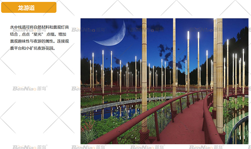 水中棧道可將自然材料和景觀燈具結(jié)合,點(diǎn)點(diǎn)“星光”點(diǎn)綴,增加景觀趣味性與夜游的屬性。