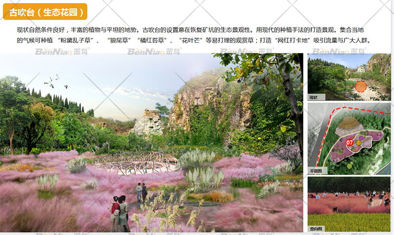 豐富的植物與平坦的地勢,古吹臺的設(shè)置意在恢復(fù)礦坑的生態(tài)景觀性。用現(xiàn)代的種植手法打造景觀,集合當(dāng)?shù)氐臍夂蚩煞N植“粉黛亂子草”、“狼尾草”、“橘紅苔草”、“花葉芒”等易打理的觀賞草,打造“網(wǎng)紅打卡地”吸引流量與廣大人群。