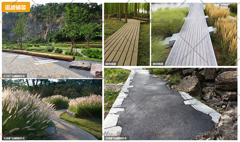 交通是游憩方式中的一項(xiàng)重要內(nèi)容,交通方式的有效設(shè)計(jì)可以在滿足游客移動的同時,形成獨(dú)特的旅游體驗(yàn)。項(xiàng)目結(jié)合場地特點(diǎn),不同分區(qū)、景區(qū)特色、區(qū)域亮化,進(jìn)行游樂化、本土化、生態(tài)化設(shè)計(jì)。游步道鋪裝材料選取、文化元素應(yīng)用,形成具有一定文化性、趣味性和參與性的特色交通方式。