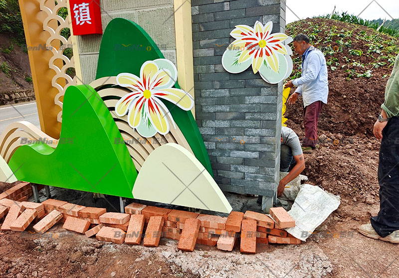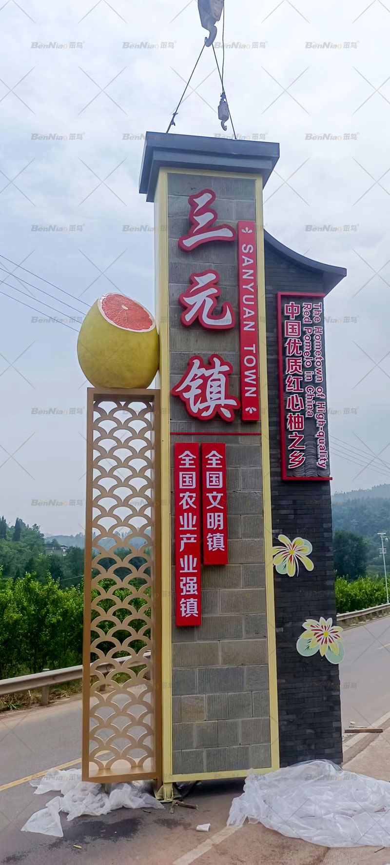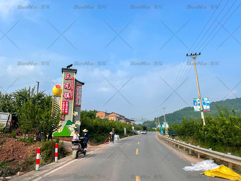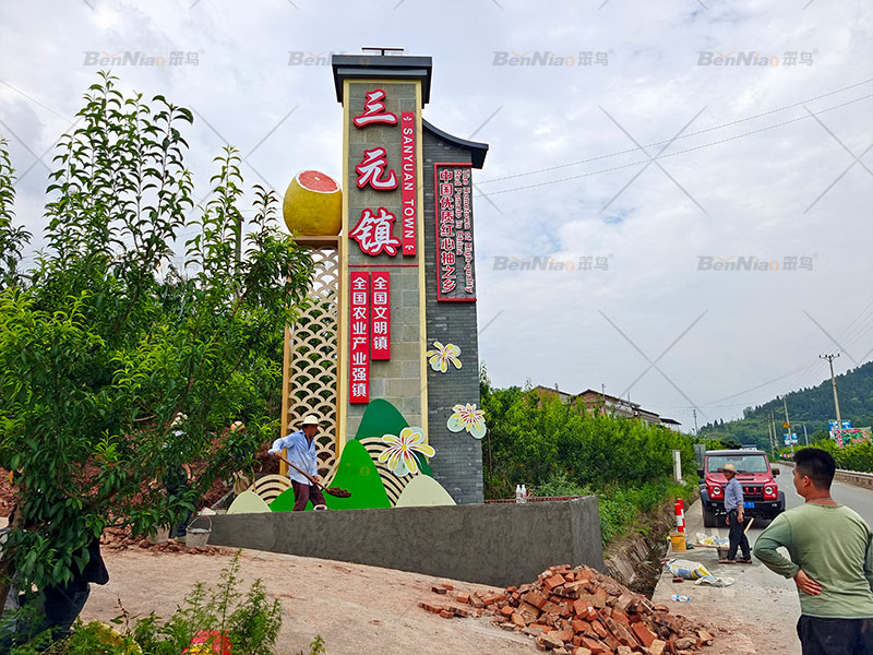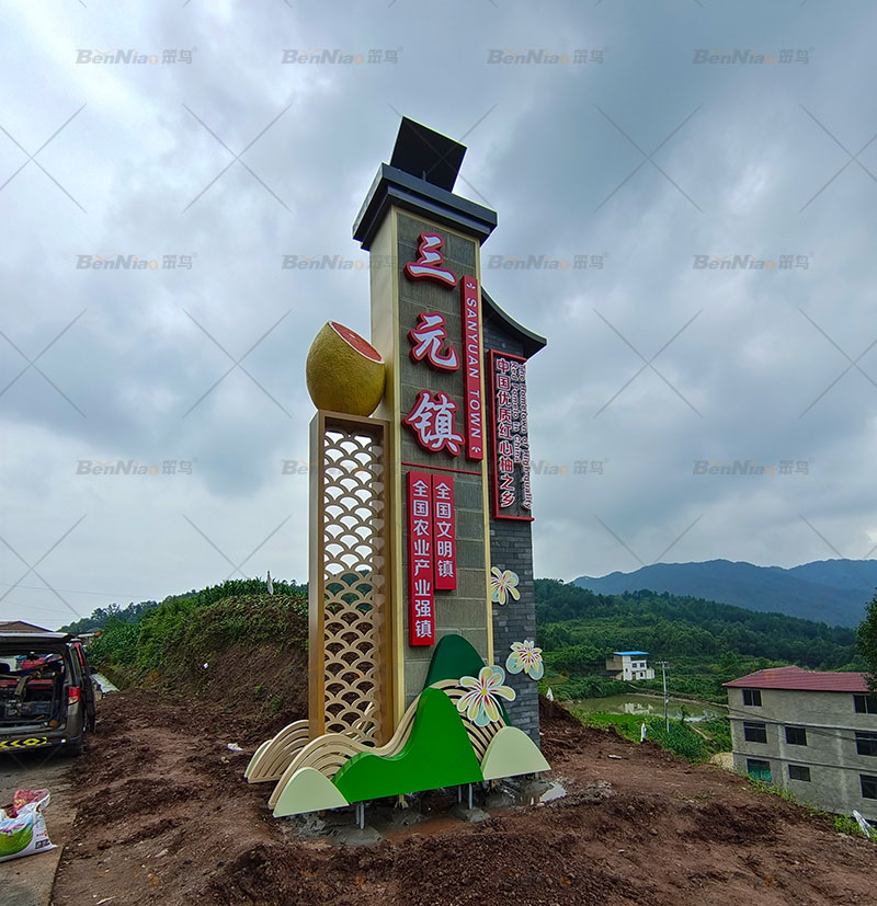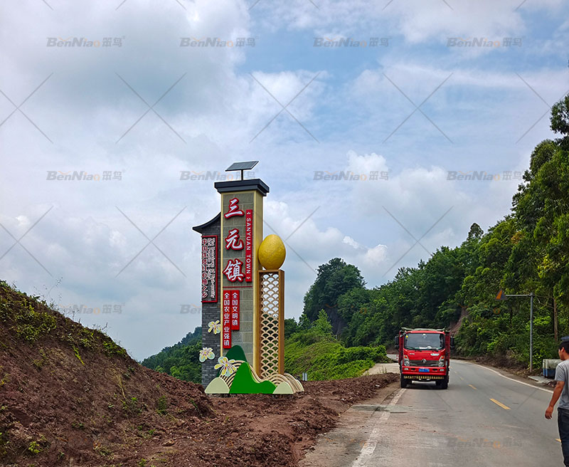 笨鳥(niǎo)文旅結(jié)合三元鎮(zhèn)道路交通實(shí)際現(xiàn)狀,沿著交通干道規(guī)劃、設(shè)計(jì)、制作、安裝了“產(chǎn)業(yè)精神堡壘、產(chǎn)業(yè)信息牌”等設(shè)施,大多采用簡(jiǎn)約風(fēng)格,統(tǒng)一主色調(diào)和設(shè)計(jì)式樣,整體效果與村情、村容、村貌、村景融為一體,相得益彰,為三元鎮(zhèn)增添一道道美麗風(fēng)景線。