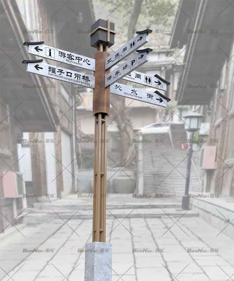隨著文旅特色小鎮(zhèn)的加速發(fā)展建設(shè),導(dǎo)視系統(tǒng)已經(jīng)成為特色小鎮(zhèn)一項重要的基礎(chǔ)公共設(shè)施,不僅可以為人們提供環(huán)境信息、指示導(dǎo)引的基本功能,還能有效的為當(dāng)?shù)鼐用癯鲂袔肀憷?,為外來游客帶來很大程度的友好感,還可以起到環(huán)境優(yōu)化和輔助管理等功能。