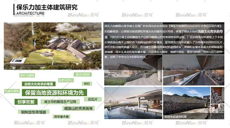 方案一提取酒廠建筑構筑要素以原石為基礎形成LOGO景觀墻,結合釀酒作物大麥雕塑,展現(xiàn)保樂力加品牌和釀酒特點。