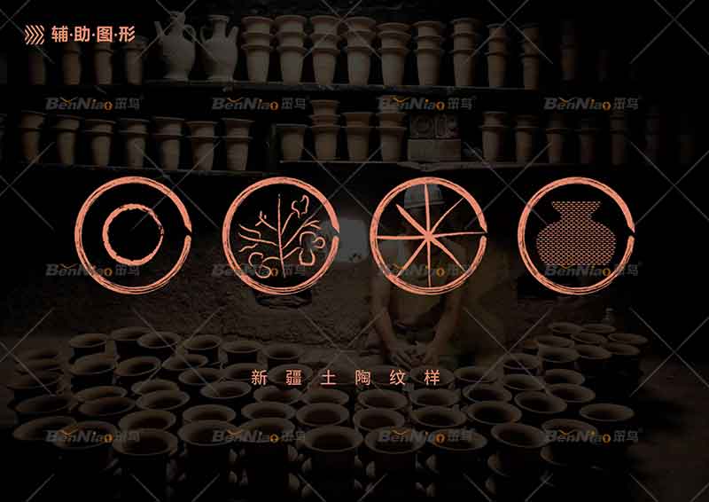 整個(gè)設(shè)計(jì)以土陶器的外形為主體,同時(shí)以具有旋轉(zhuǎn)態(tài)勢的幾何圖形,圓寓意土陶燒制技藝中的拉胚過程,配合陶土的紋理進(jìn)行呈現(xiàn),并在LOGO中融入唐王城遺址和屯墾軍民的剪影。著力表現(xiàn)品牌其獨(dú)特的文化屬性,主題鮮明,寓意深刻,賦予了品牌識(shí)別性,凸顯圖木舒克土陶技藝的獨(dú)特地域特征。