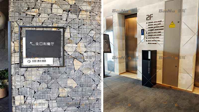這種標(biāo)識(shí)一般以燈箱的形式或立牌的形式安裝于酒店各公共區(qū)域建筑物交叉處來引導(dǎo)酒店各區(qū)域的方向指示,使酒店各區(qū)域的引導(dǎo)更有方向感和目的性。