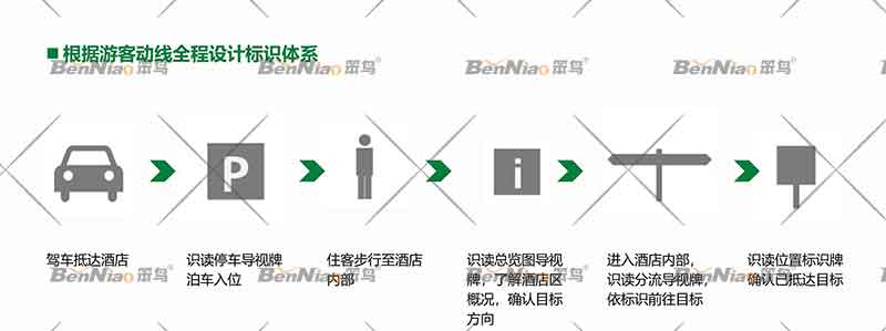 位置和數(shù)量的控制是設(shè)計(jì)的至關(guān)要素,酒店標(biāo)識(shí)是不是可以隨意設(shè)置的,設(shè)置標(biāo)識(shí)少了會(huì)功能性不足,多余了將成為視覺上的污染。我們分析了大觀酒店的人車流線及功能區(qū)域并進(jìn)行了標(biāo)識(shí)的點(diǎn)位布局。