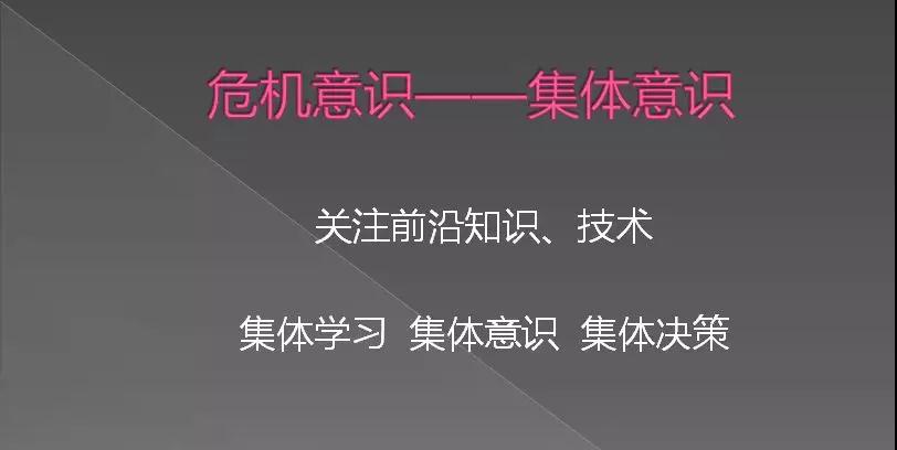 集體意識要有意識,這很重要。那么大家就要集體學(xué)習(xí),學(xué)習(xí)前沿的知識,學(xué)習(xí)前沿的技術(shù),學(xué)習(xí)前沿的思維和工作方法,這樣才能達到一個集體意識的基本面,只有在這樣的情況下你才能夠去參與集體決策。