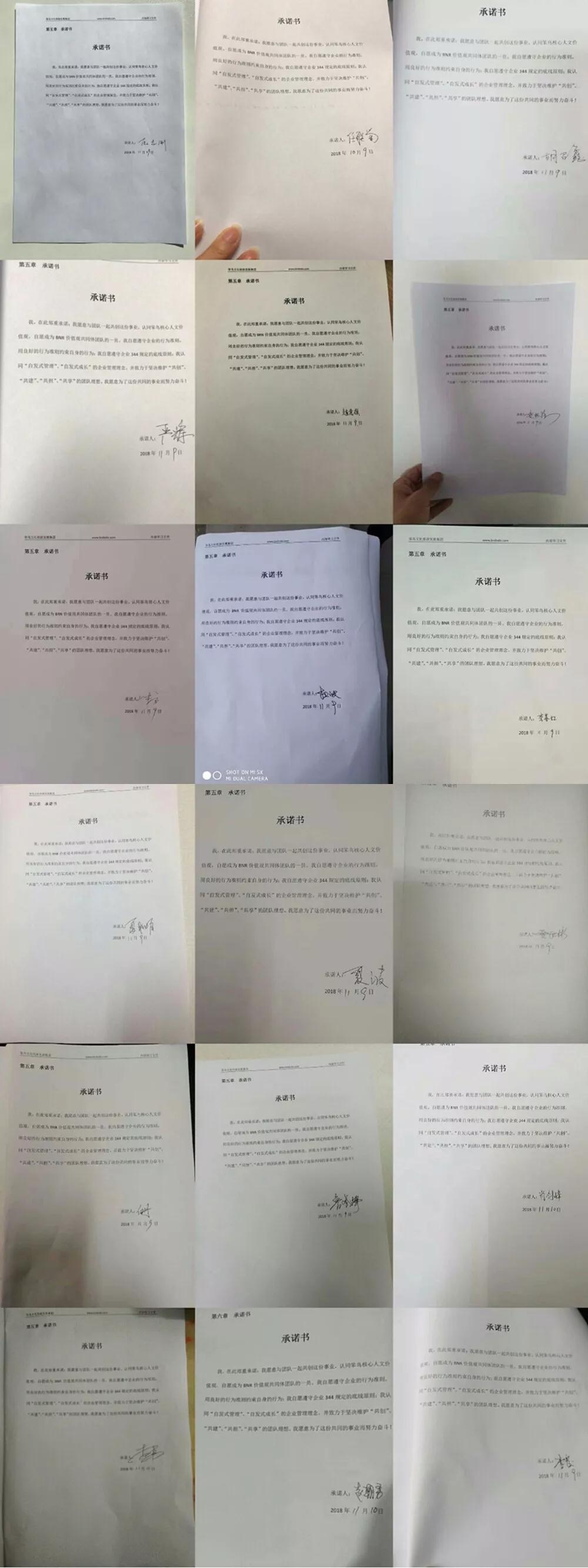 重慶總部辦公室、北京團(tuán)隊(duì)、公司廠部所有員工都自愿簽訂承諾書,愿意與團(tuán)隊(duì)一起共創(chuàng)這份事業(yè),認(rèn)同笨鳥核心人文價(jià)值觀,自愿成為BNR價(jià)值觀共同體團(tuán)隊(duì)的一員。自愿遵守企業(yè)的行為準(zhǔn)則,用良好的行為準(zhǔn)則約束自身的行為;自愿遵守企業(yè)344規(guī)定的底線原則;我認(rèn)同“自發(fā)式管理”、“自發(fā)式成長(zhǎng)”的企業(yè)管理理念,并致力于堅(jiān)決維護(hù)“共創(chuàng)”、“共建”、“共擔(dān)”、“共享”的團(tuán)隊(duì)理想。為了這份共同的事業(yè)而努力奮斗!